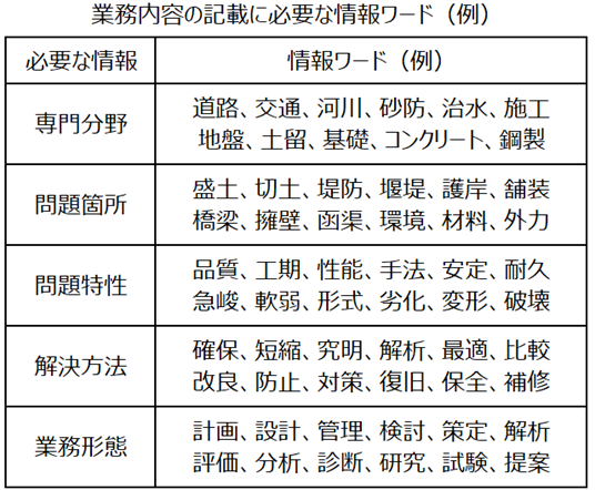 技術士にふさわしい業務の内容を端的に表現するには、専門分野、問題箇所、問題特性、解決方法、業務形態を表わす情報ワードを下表のように設定し、これらを組み合わせるのが効果的です。