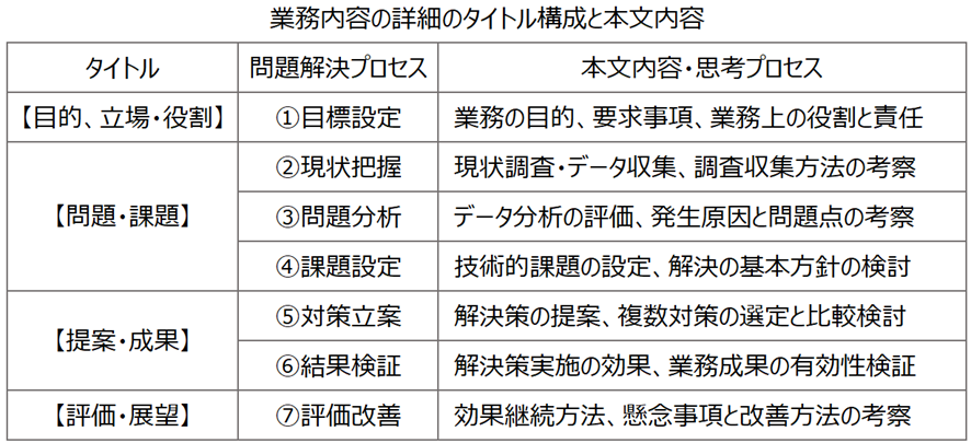 次に、口頭試験では、複合的な問題の解決プロセス(目標設定→現状把握→問題分析→課題設定→対策立案→結果検証→評価改善)の実践経験を確認されます。そのため、詳述業務は、「問題解決プロセスが示しやすい」業務を選ぶのが有効です。