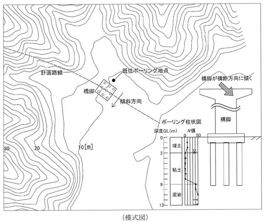 模式図に示すように、丘陵地を横断する道路橋の建設工事において、基礎杭を打設して橋脚を施工したところ、数日して橋脚が傾いていることが判明した。あなたがこの橋脚の変状原因を究明し対策を検討する担当責任者として業務を進めるに当たり、下記の内容について記述せよ。