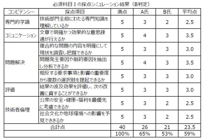 以下の表に0.5点足りずにB判定となるシミュレーション結果の例を示します。同じ答案をA氏は26点、B氏は21点と採点したケースです。この場合、二人の平均点は23.5点となるので不合格となります。