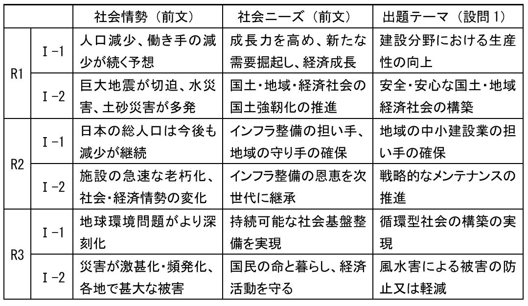 出題テーマは、社会ニーズを達成するために、建設部門が実現すべき目標です。過去6問の出題テーマは、すべて違っています。社会情勢や社会ニーズが同じでも、出題テーマを毎回変えていることから、おそらく今年も過去問とは違うテーマが出題されると考えられます。