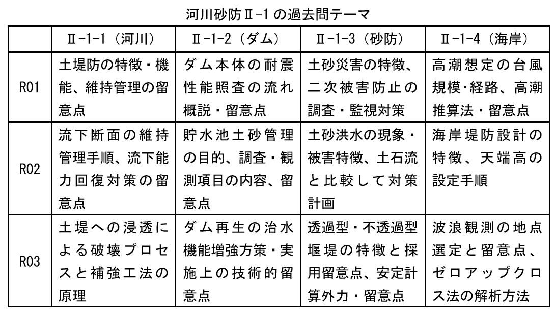 河川砂防のⅡ-1は、河川、ダム、砂防、海岸の4分野の問題が1問ずつ出題されており、この傾向は令和4年度も変わらないと思います。