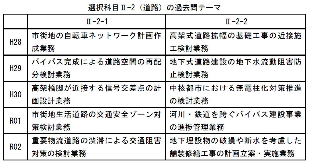 都市部や市街地の条件で、出題されることが多いようです。そのため、都市部や市街地での道路事業、道路建設におけるリスクを想定しておくと良いでしょう。トレンディなテーマは出題されていないので、想定しなくても良いと思います。
