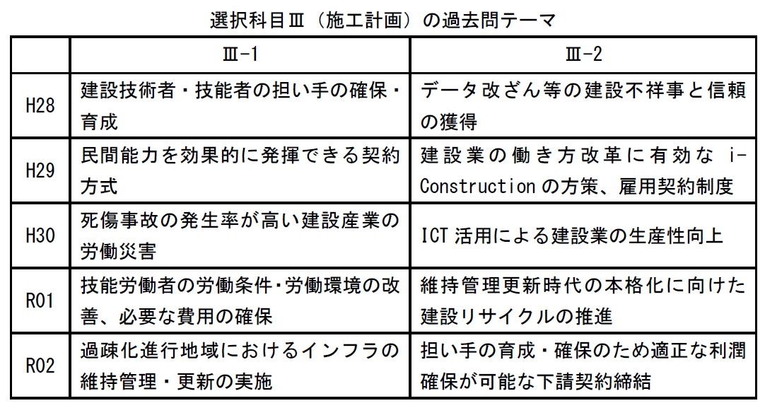 選択科目Ⅲは、トレンディなテーマが出題されます。過去5年間の出題傾向を見ると、建設業界の問題と建設現場の問題にわかれます。