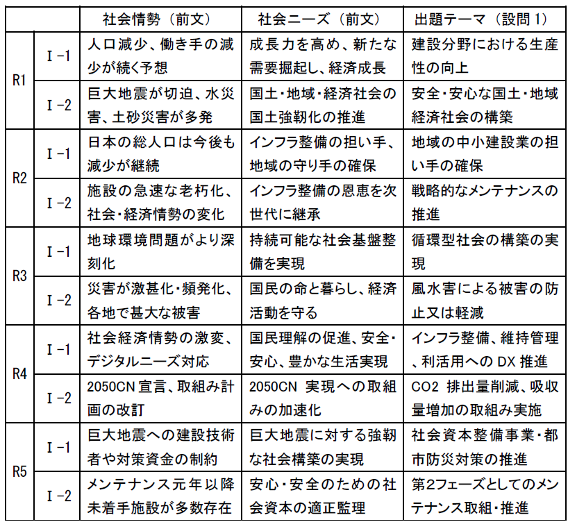 出題テーマは、社会ニーズに応えるために、建設部門が実現すべき目標です。過去10問の出題テーマは、すべて違っています。社会情勢や社会ニーズが同じでも、出題テーマを毎回変えていることから、おそらく今年も過去問とは違う出題テーマになると想定されます。